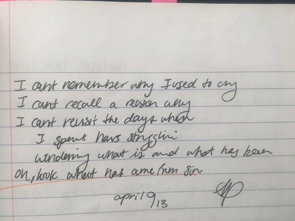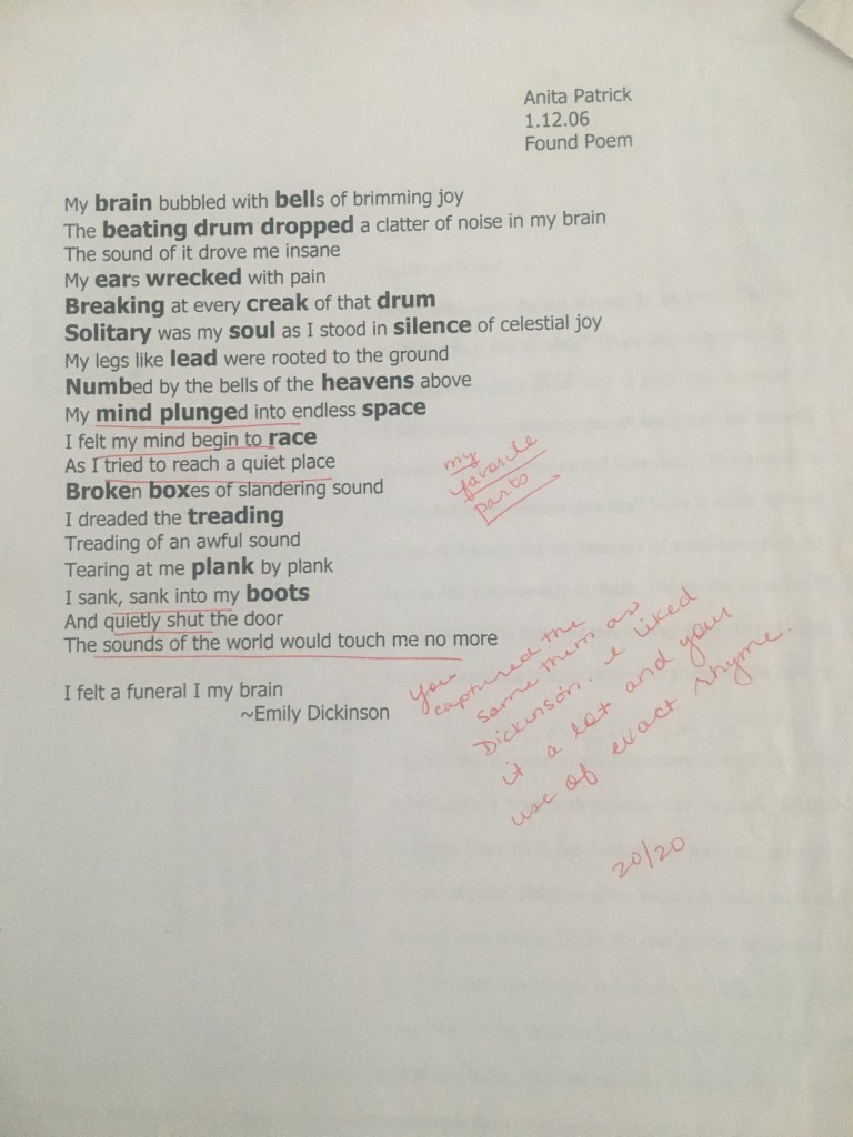 This is a language arts assignment from 10th grade. We were charged with picking words from a poem and making our own work from it. One of my favorite poets at 16 was Emily Dickinson, I picked “I felt a funeral in my brain”.