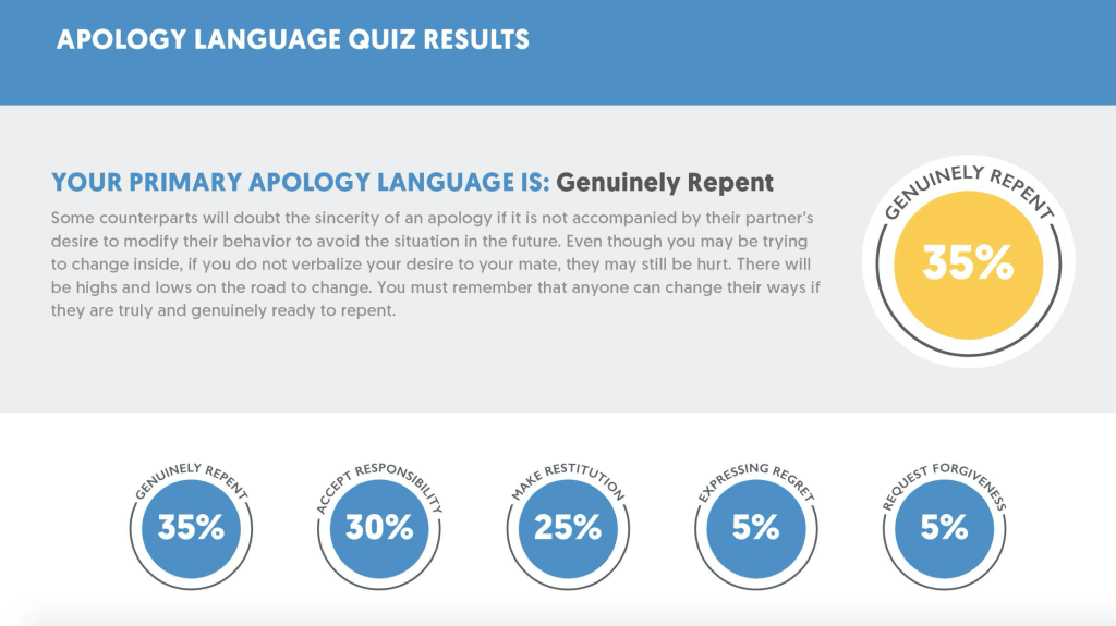 I stumbled upon this about mid-March of last year. In trying to learn about myself and building/maintaining better relationships, I was on a search in learning about forgiveness. Learning to forgive and be forgiven has definitely been a journey and the 5 Apology Language Quiz has helped me tremendously! I actually took it again today because I felt I needed to check-in with myself. ☺️