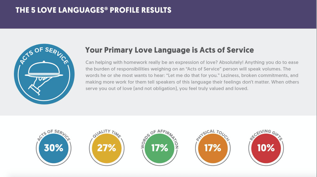 Alrighty, so that’s awesome! Hopefully you take the 5 Love Language Quiz and learn something new about yourself. (Note: I have found my love language changes through the years. Like any personality quiz I like to reevaluate from time-to-time to see where I am at. If you are curious on a timeline, I’d say I do this quiz about once a year or as needed when I feel like I am missing the mark in communicating effectively with my friends and loved ones.)