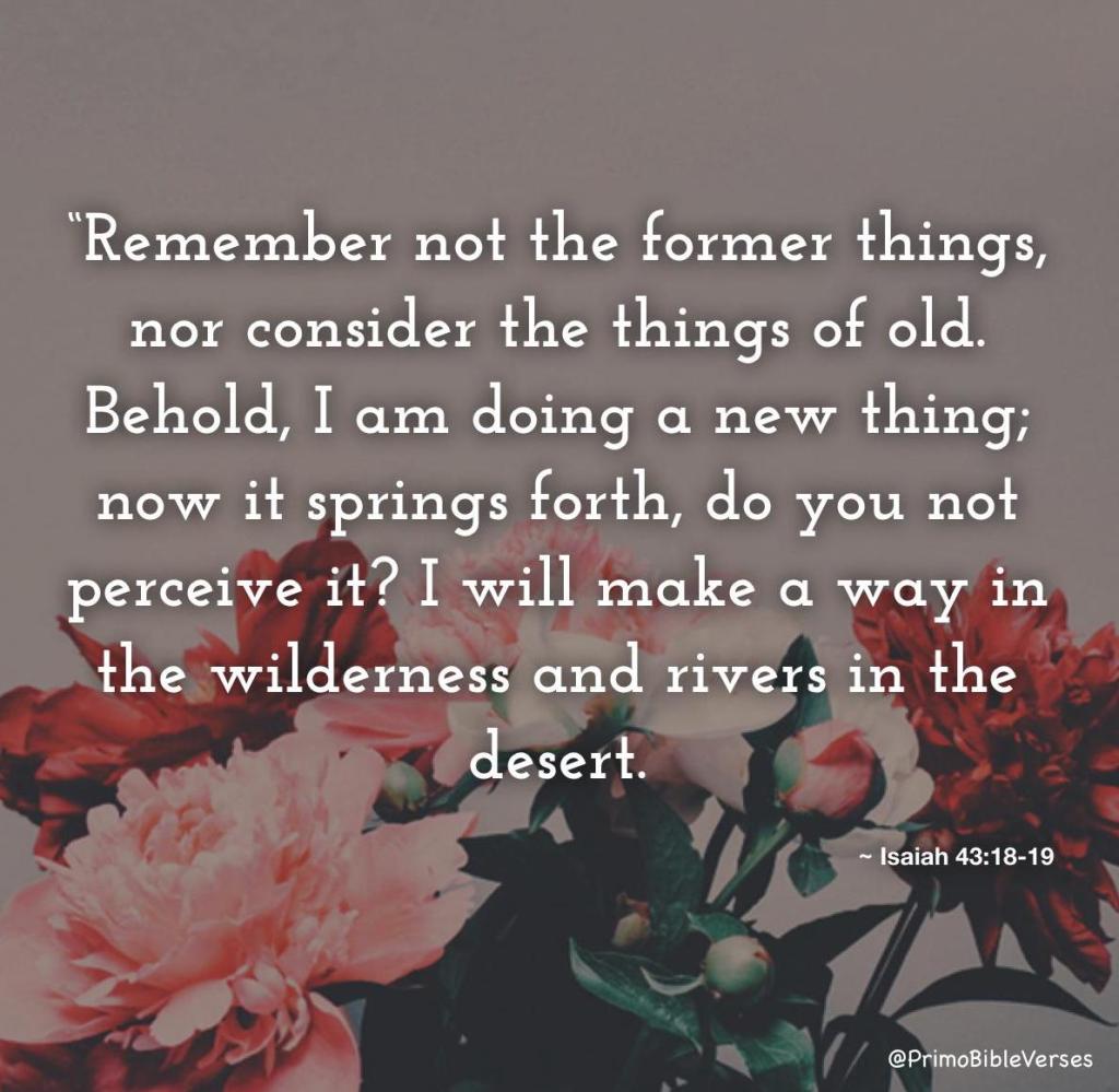 Remember not the former things, nor consider the things of old. Behold, I am doing a new thing; now it springs forth, do you not perceive it? I will make a way in the wilderness and rivers in the desert.